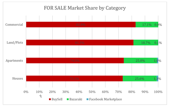 Bazaraki holds the second position in all categories, with higher shares mainly in Houses (25.6%) and Apartments (25.0%), indicating stronger competition in residential categories. Its shares are lower in Commercial properties (17.1%) and Plots/Land (18.7%).