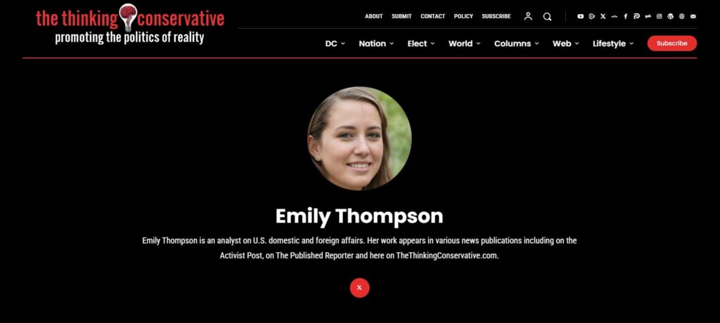 “Emily Thompson” links to articles on thethinkingconservative.com that purportedly carry her byline. However, the accompanying author photograph appears artificial, likely AI-generated or heavily manipulated upon close examination.