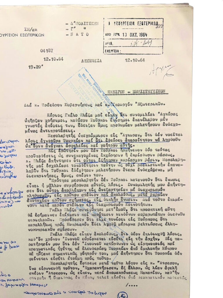 Alexandrakis outlines the key points he gathered from his contacts with the then UN mediator on the Cyprus issue, Galo Plaza. According to Plaza, Turkey would not accept a settlement unless “its needs” in the field of security, as well as its “prestige”, were taken into account. The mediator tells Alexandrakis that the primary objective of the Turks is the separation of populations, followed by “double enosis” (partition combined with the parallel union of the Greek Cypriot part with Greece).