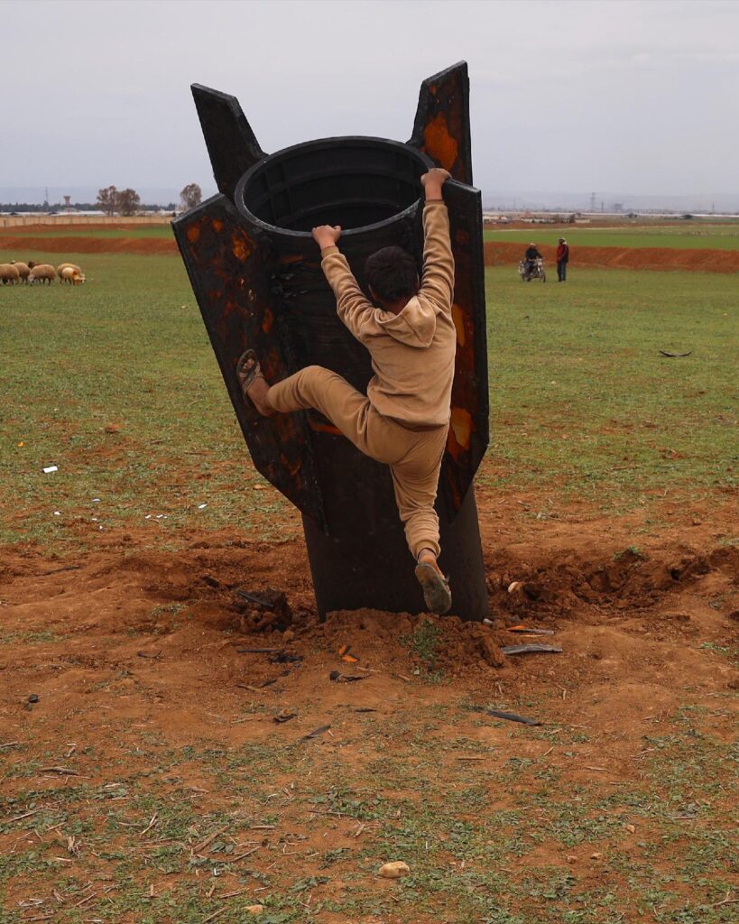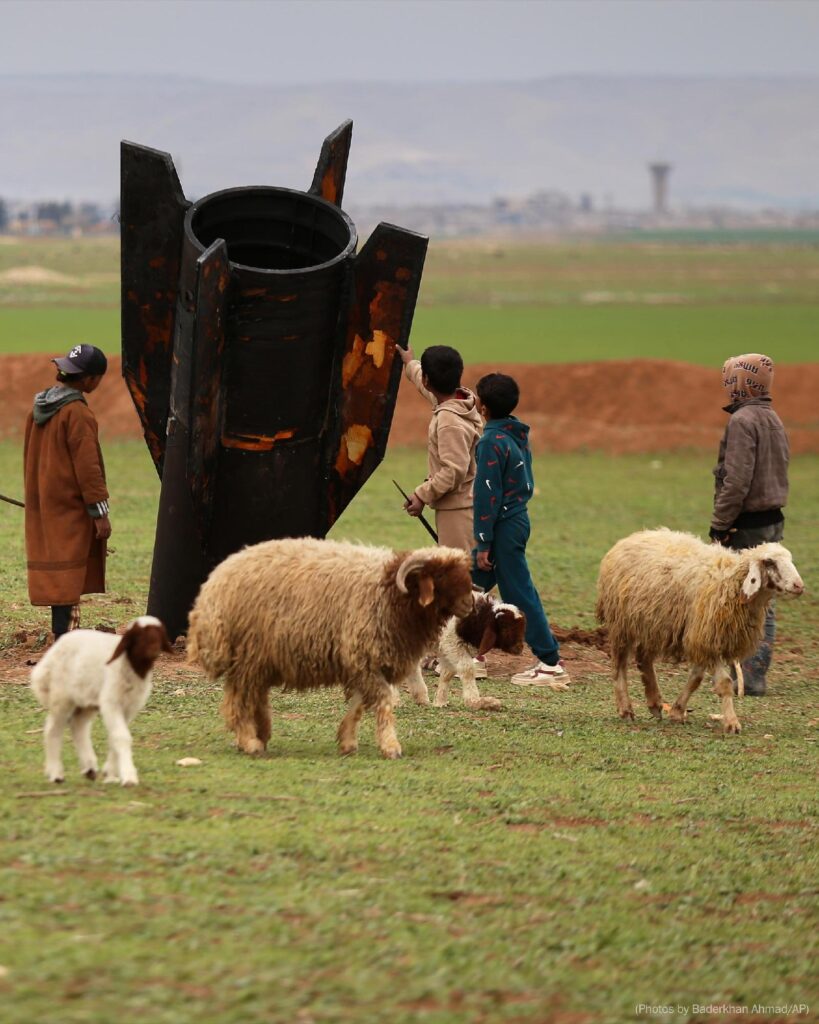 Images released by The Associated Press show villagers, including a Syrian boy, inspecting the black missile with burnt orange markings. The projectile did not explode upon impact, leaving it lodged in the ground. Local reports confirmed no casualties or injuries.