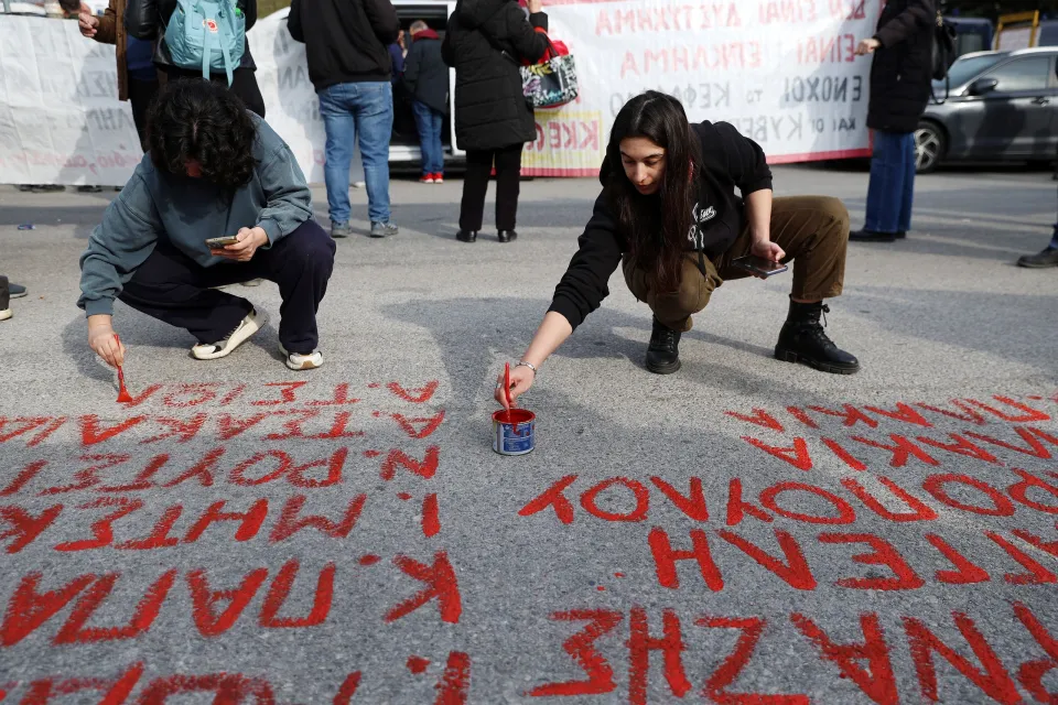 Outside the courthouse, crowds gathered with banners and slogans. Young people wrote the names of the victims on the pavement in red paint. Security measures were strict both inside and outside the building.