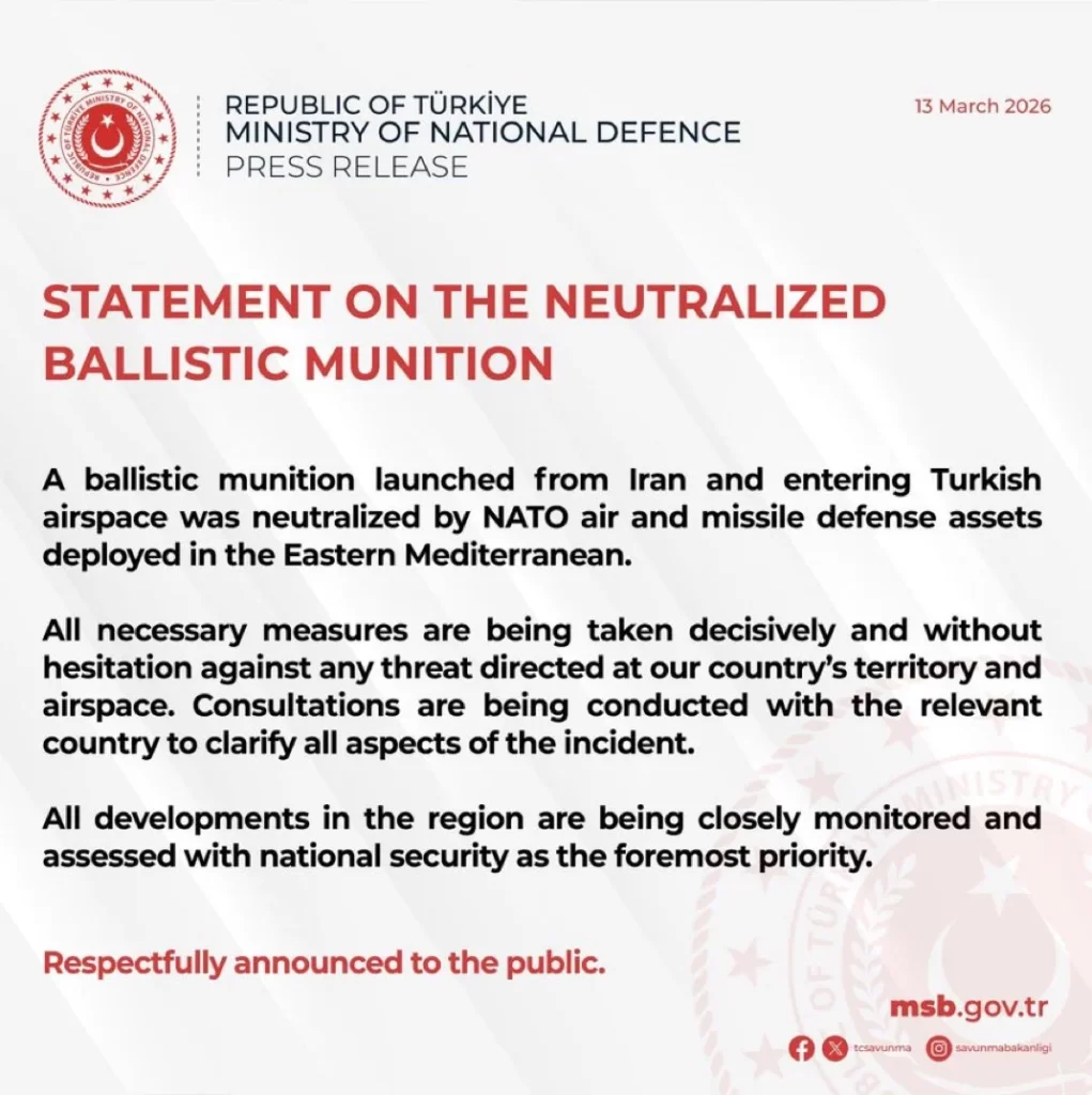 Turkey’s Ministry of Defence confirmed that a third ballistic missile launched from Iran entered Turkish airspace but was intercepted by NATO air defence systems deployed in the eastern Mediterranean. Ankara said all necessary measures are being taken to safeguard national security as tensions in the region continue to rise.