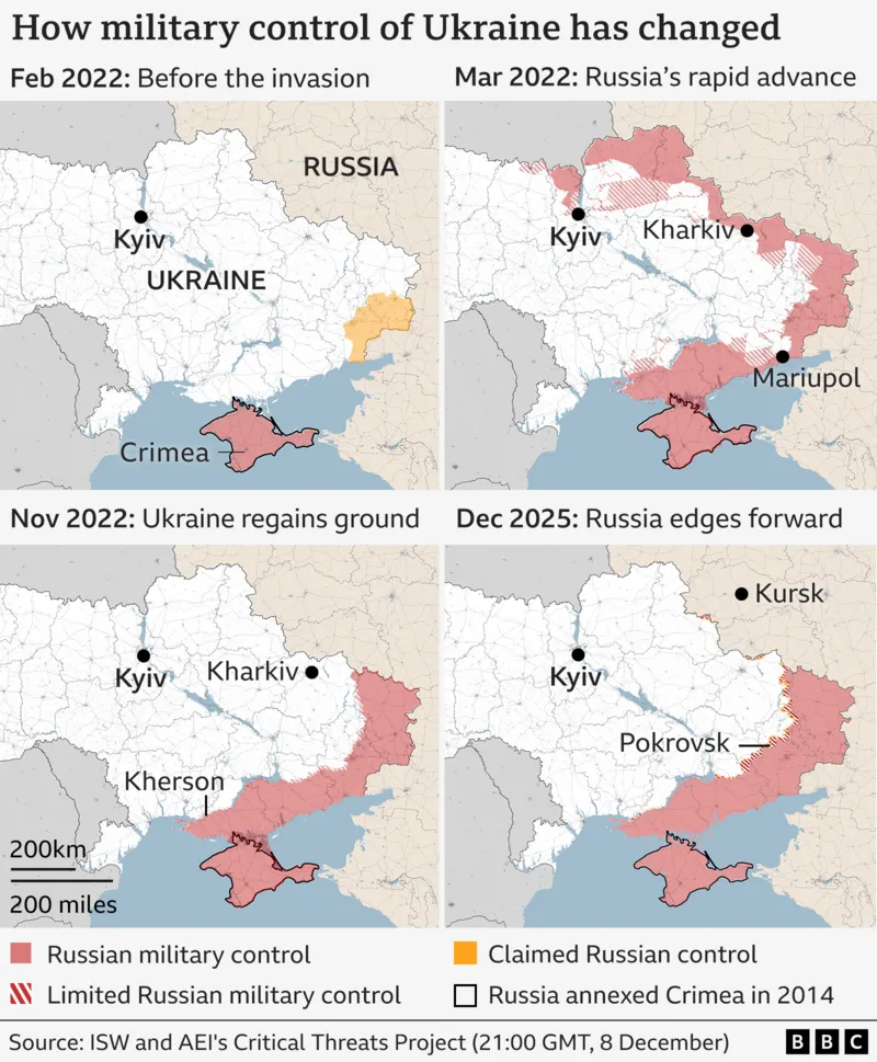 Talks to end the war persist following a US-backed peace plan unveiled in November, seen as favourable to Russia. Kyiv prepares to present an alternative proposal to the White House to avoid ceding land to Moscow. The following maps and analysis show the ground situation as of early December 2025.