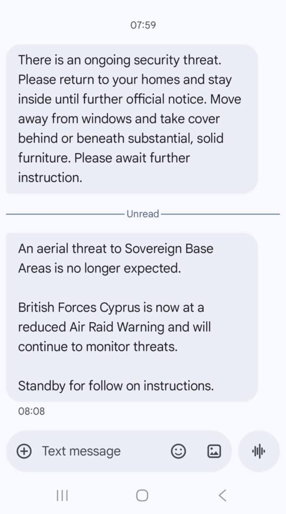 Residents of Akrotiri received a warning message on Tuesday morning alerting them to a possible attack on the British Bases.